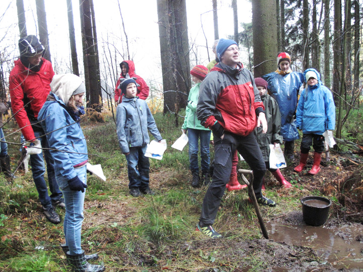 Als wir, "Team Auto", als O-Wandersleute verkleidet, mit der ältesten Tochter (samt Prinz) der Lengefelder OL-Königin - die zwischen dem All und dem Tag noch reichlich Karten erstellt, Zauberei! - als wir also nun an der Reihe sind, Wasser aus Schlamm zu schöpfen, nähert sich ein Wolf, gut, ein Hund, eine Hündin. Sie hüpft am wildesten herum. Die Kinderschar hinter ihr sieht und hört sich die erste Aufgabe gleich mit an. Erwachsene, wie Postmann Leibi, begleiten den Tross.